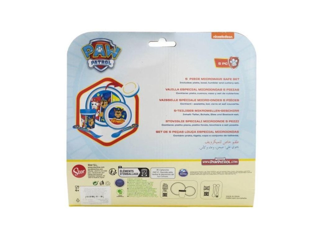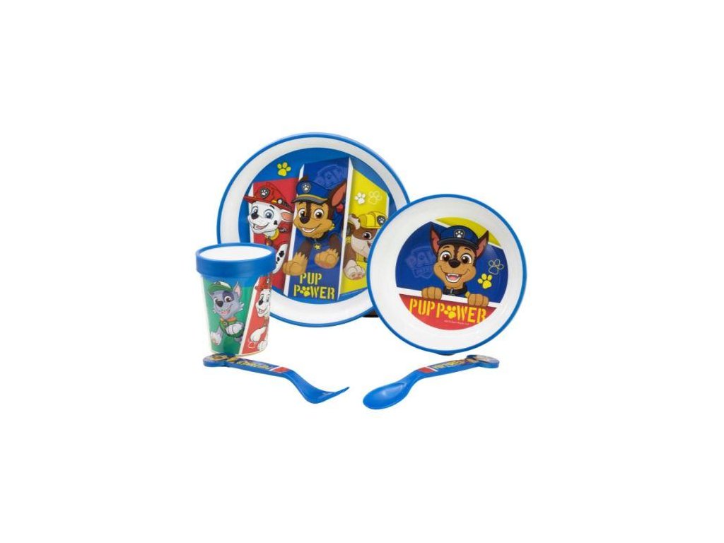 Praktická plastová jídelní souprava Tlapková Patrola obsahuje vše, co děti potřebují k jídlu – talíř, misku, kelímek, lžičku a vidličku. Ideální na domácí stolování, výlety nebo školní obědy. Skvělý dárek k narozeninám, svátku, odměně za školní výsledky nebo prostě pro radost malého fanouška Tlapkové Patroly.