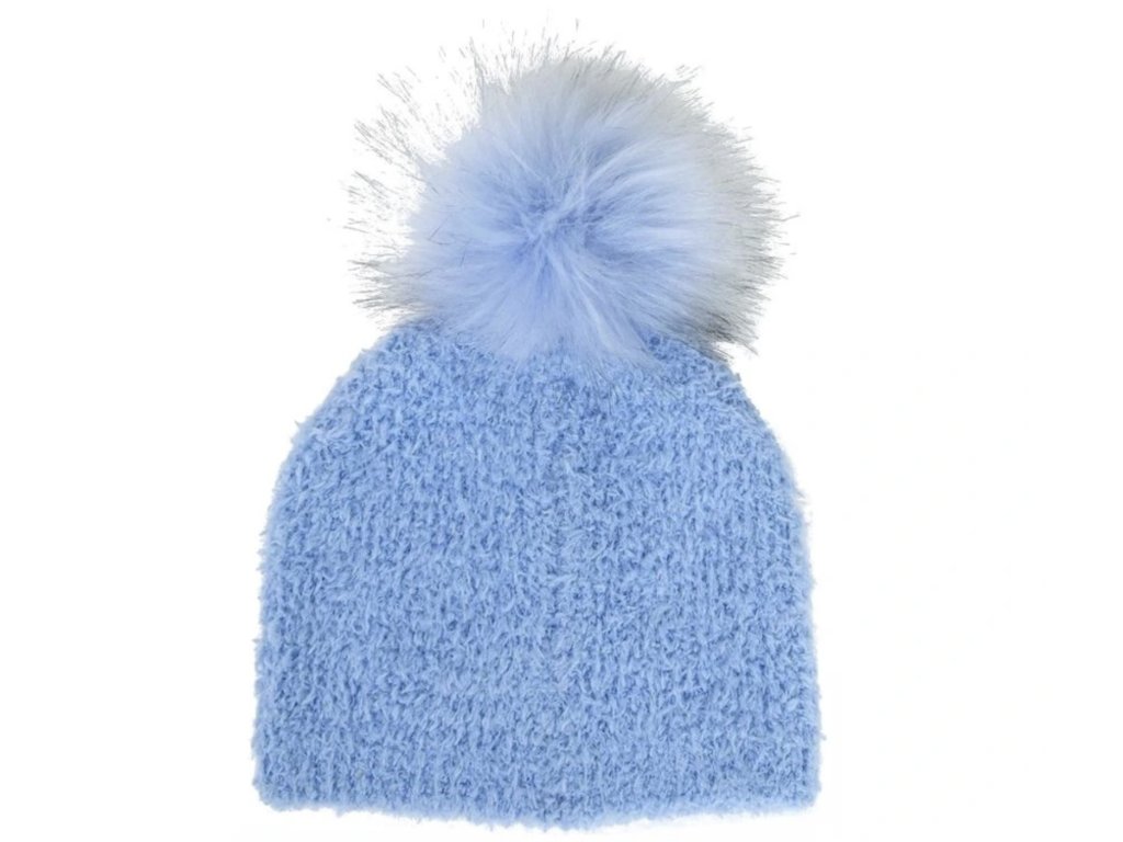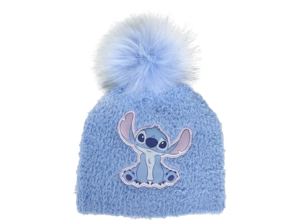 🐾 Veselý design – modrá čepice s bambulí a motivem šťastného Stitche.