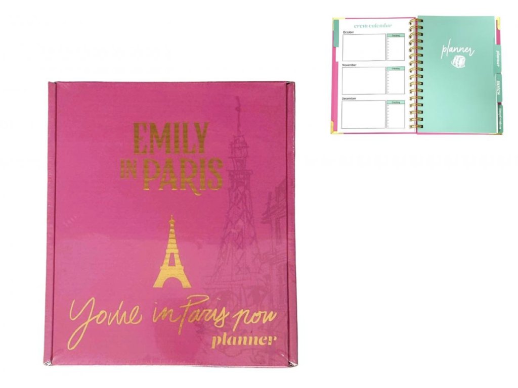 Obsah: plánovač událostí, týdenní plánovač, denní kalendář, arch se samolepkami Emily in Paris, poznámkové a inspirační listy